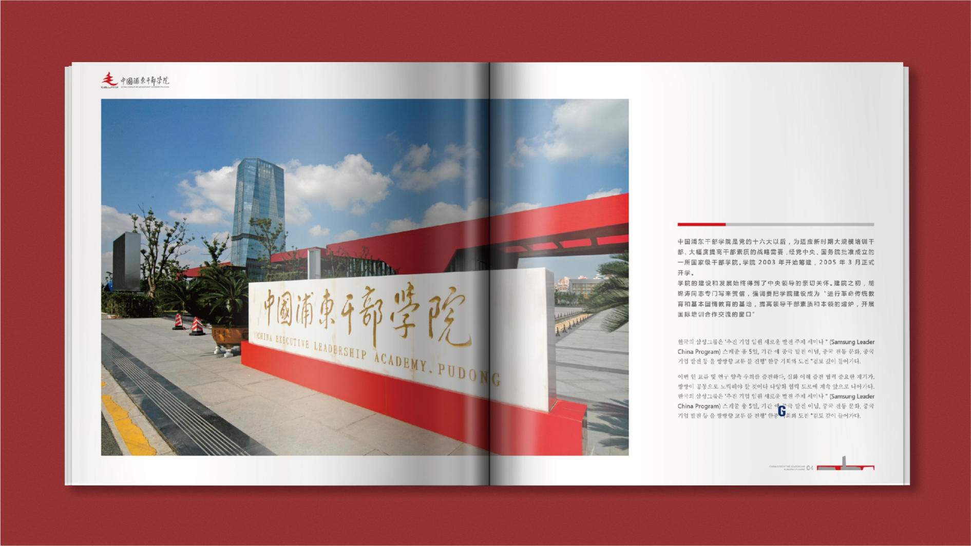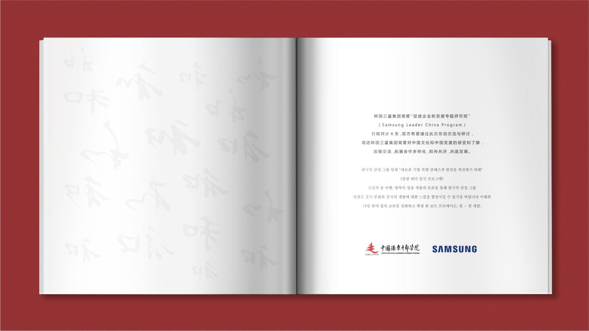 作為對(duì)外交流的傳播需要,和與德為浦東干部學(xué)院設(shè)計(jì)了“中韓雙語(yǔ)畫(huà)冊(cè)”,促進(jìn)了與韓國(guó)三星集團(tuán)高管“促進(jìn)企業(yè)新發(fā)展專(zhuān)題研究班”的交流,拓展了合作的多樣化,和州共濟(jì),共同發(fā)展。