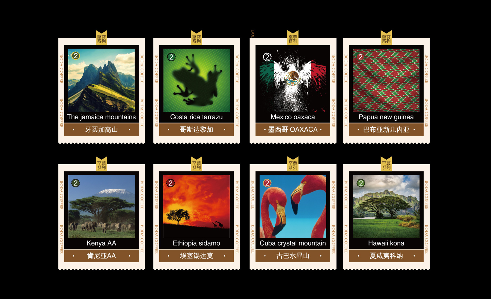 博達咖啡主打輕奢進口的咖啡粉,咖啡豆均源自牙買加,墨西哥,古巴,夏威夷等盛產咖啡豆的地方,其品類多且臻貴,是一個集融合全球81種臻稀咖啡品質的咖啡品牌。和與德結合全球咖啡豆產源地的自然和人文特色,作為包裝的主要設計亮點,其顏色也根據地區特色進行分類,整體包裝質感高級,特色鮮明。