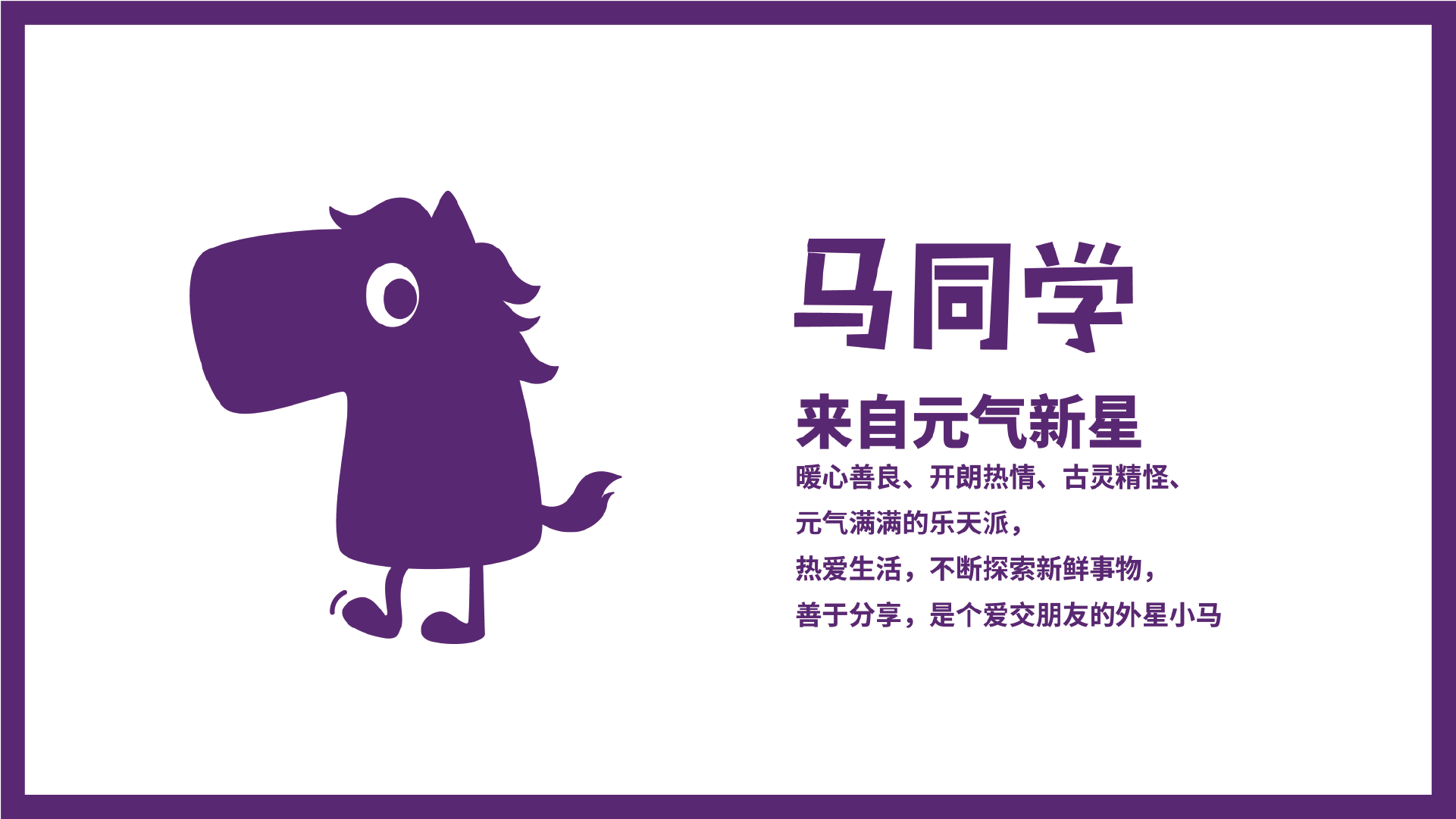 來自元氣新星的馬同學,是一位暖心善良、開朗熱情、古靈精怪、元氣滿滿的樂天派。他熱愛生活,不斷探索新鮮事物,善于分享,是個愛交朋友的外星小馬。